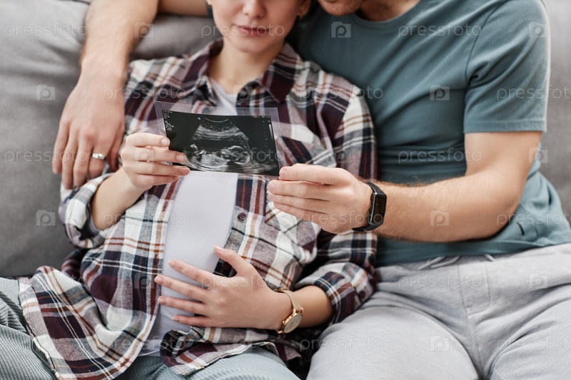 Близкий снимок пары, ожидающей ребенка с беременной молодой женщиной, держащей рентгеновское изображение