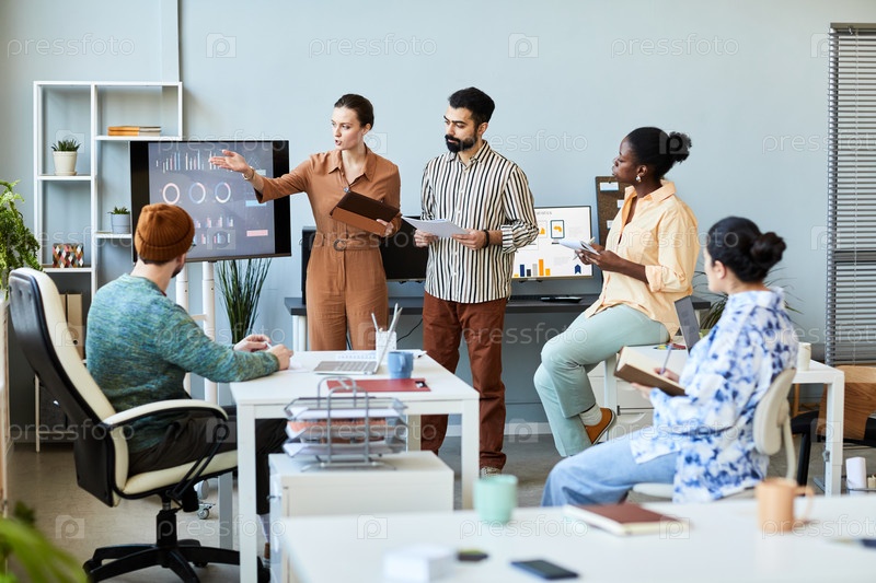 Два молодых уверенных в себе менеджера делают отчет об изменениях рыночных ставок