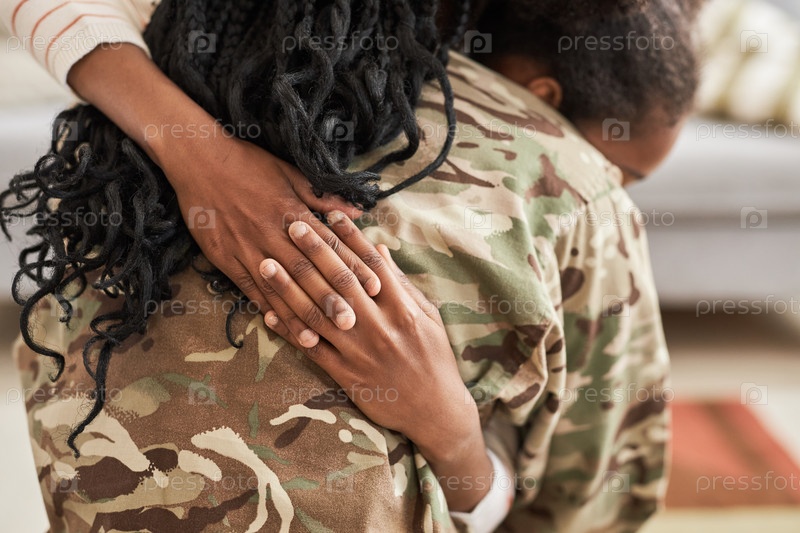Военная мама обнимает своего маленького ребенка