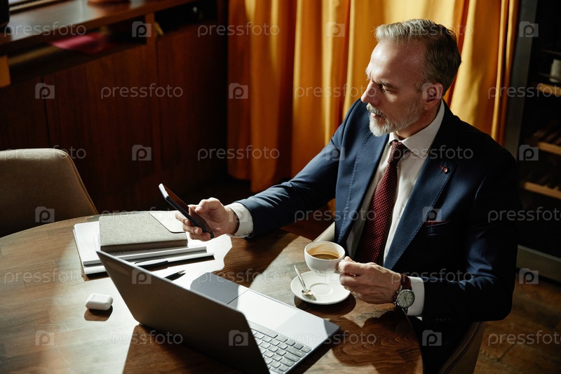 Бизнесмен читает сообщение на смартфоне в кафе