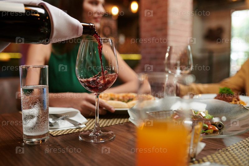 Официант наливает вино в стакан