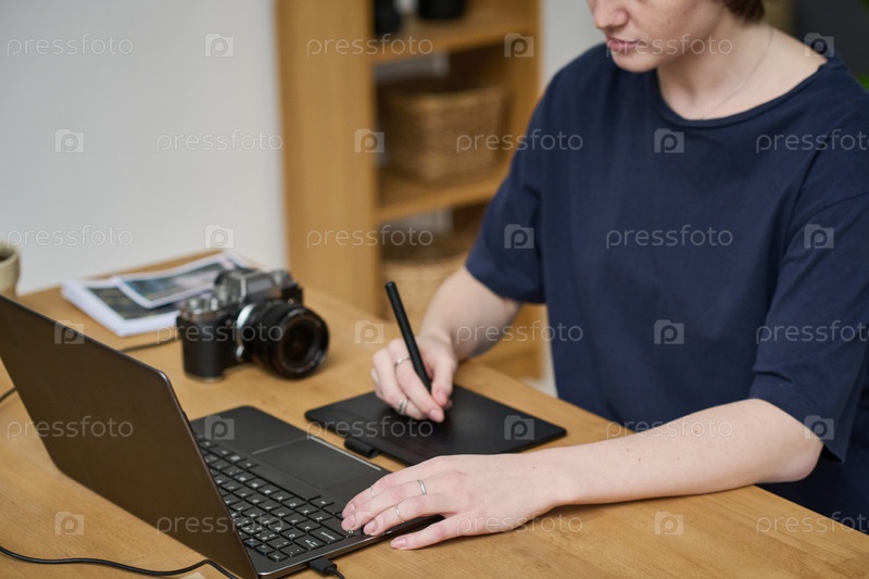 Дизайнер использует планшет для ретуширования фотографии