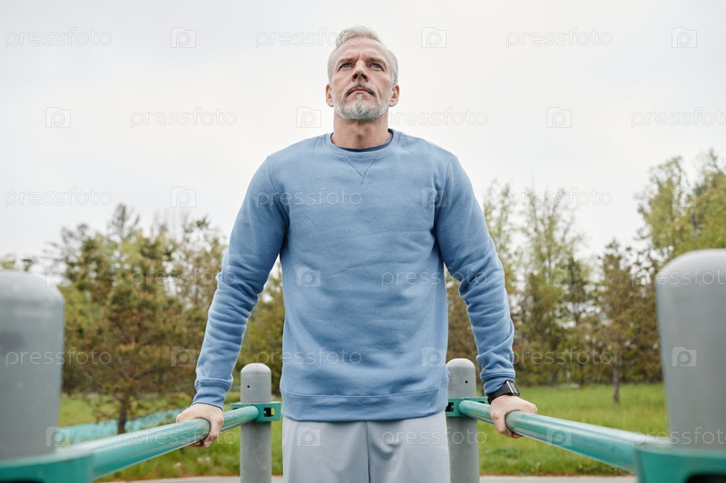 Старший человек на параллельных барах в открытом воздухе