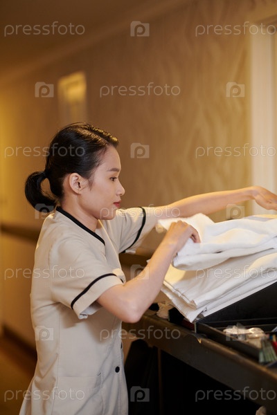 Служанка меняет полотенца в комнатах