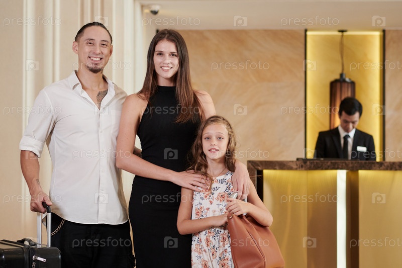 Счастливая семья в гостиничном зале
