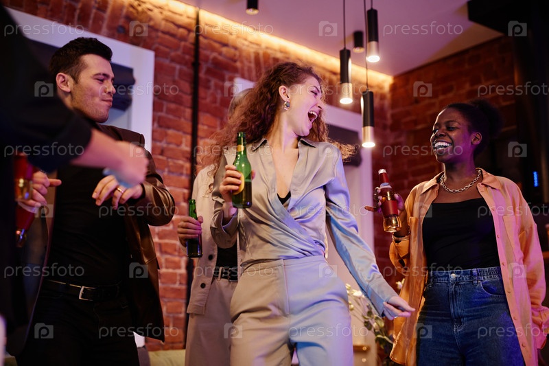 Счастливая молодая женщина в сером костюме с бутылкой пива танцует среди друзей