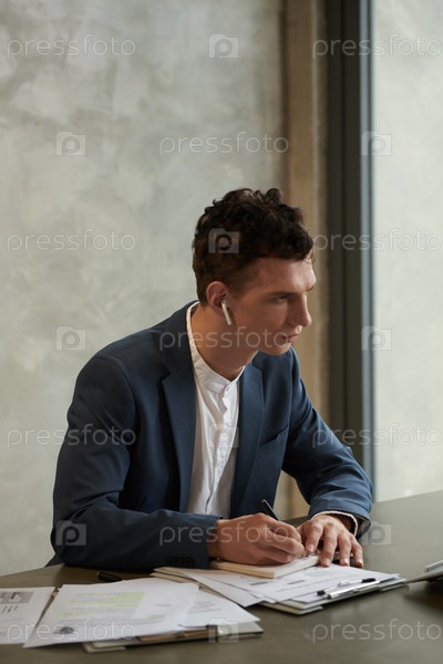 Серьезный бизнесмен, наблюдающий за презентацией продукта