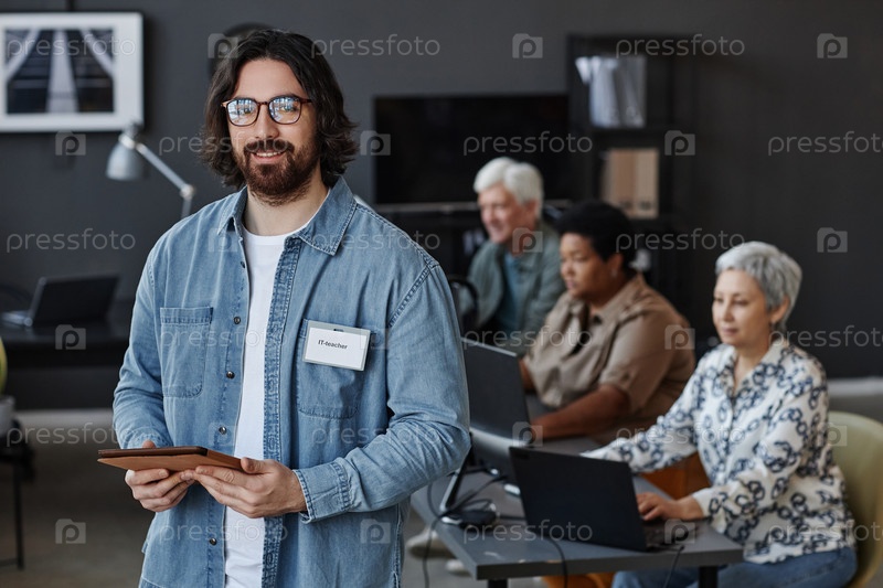 Улыбающийся бородатый мужчина как учитель в классе ИТ-компьютера для старшеклассников