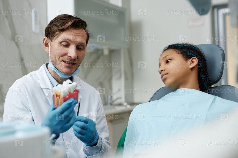 Дружелюбный стоматолог держит модель зуба во время консультации с ребенком