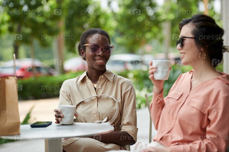 Улыбающиеся женщины пьют кофе и обсуждают продажи и сделки