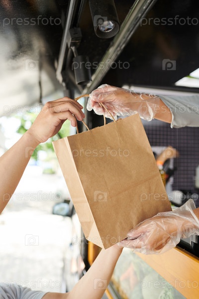Близкий план рук молодого потребителя, берущего бумажный пакет с фаст-фудом