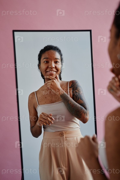 Молодая чернокожая женщина с татуировками и рубцами от акне смотрит в зеркало