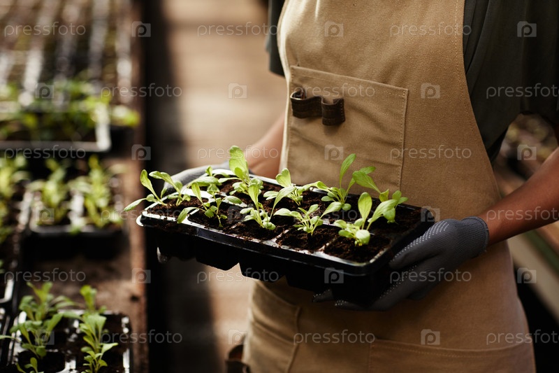 Средняя часть молодой самки в перчатках и рабочей одежде, держащей саженцы