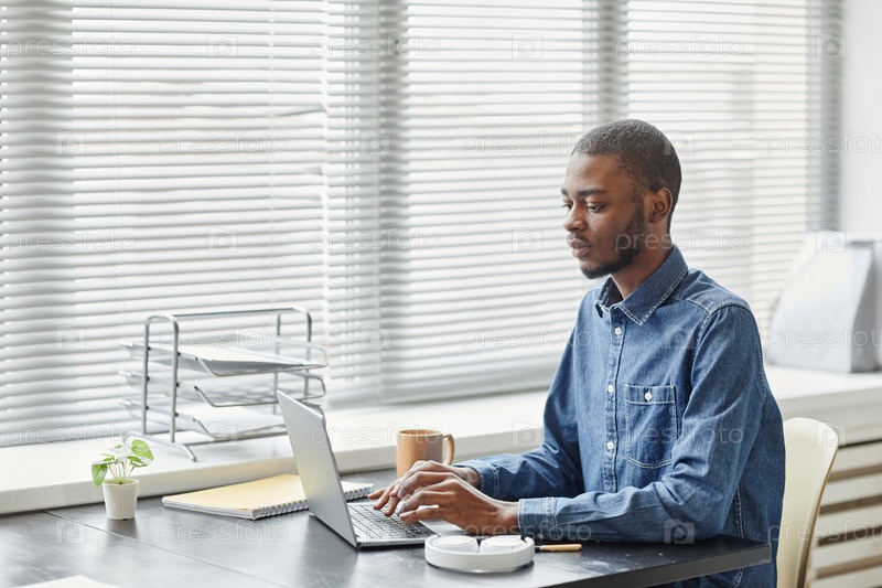Молодой чернокожий мужчина, работающий в офисе Side View