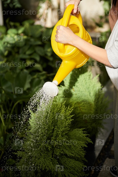 Женщина поливает кустарники на заднем дворе