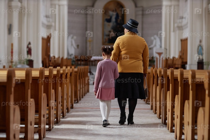 Бабушка посещает церковь с маленькой девочкой