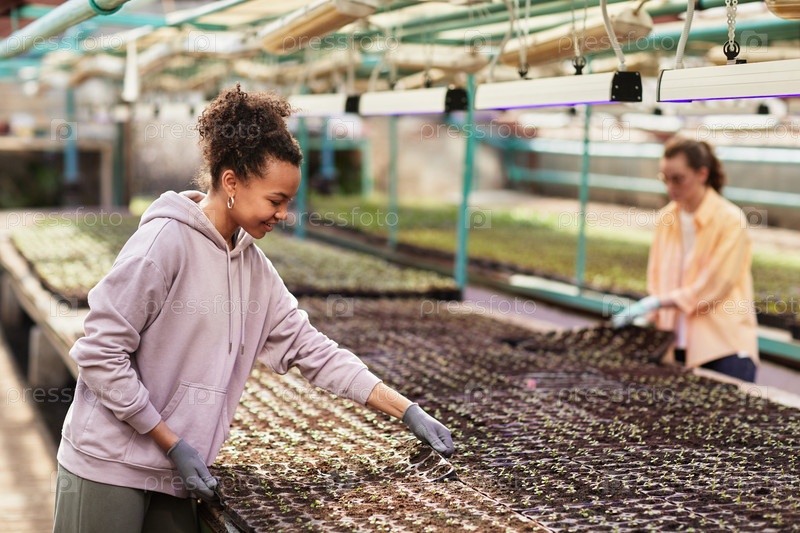 Счастливая молодая фермерка, склонившаяся над большим дисплеем с саженцами