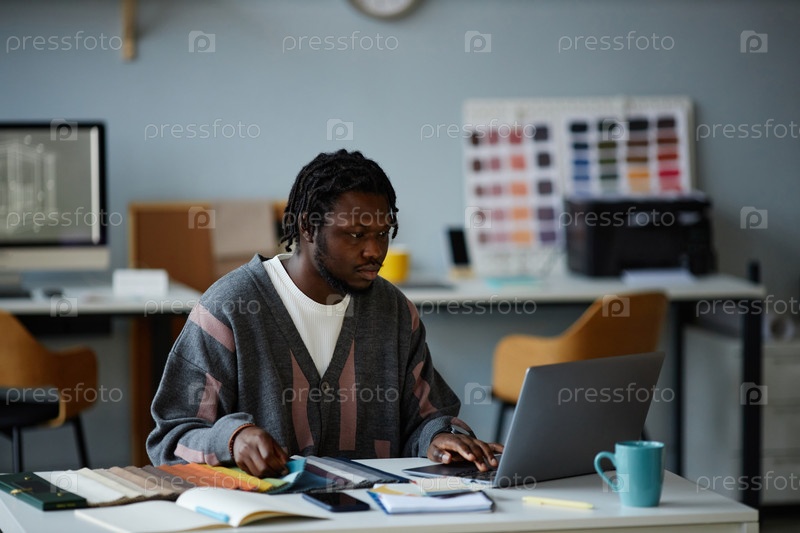Дизайнер работает на ноутбуке в офисе