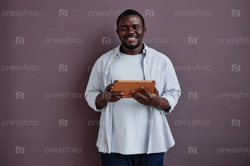 Улыбающийся чернокожий мужчина с откровенными эмоциями стоит на фоне фиолетового цвета и держит планшет