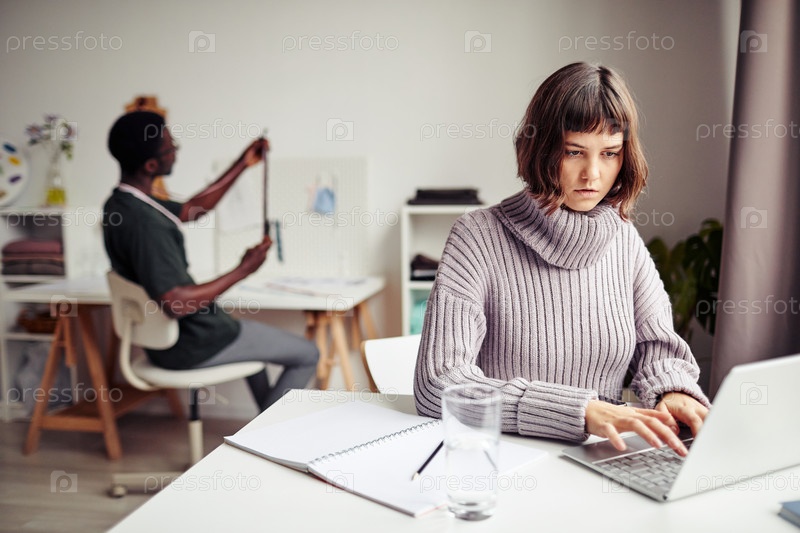 Концентрированная женщина, работающая на ноутбуке