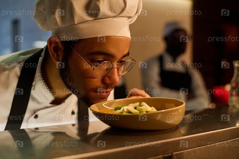 Лицо молодого повара в форме, пахнущего свежим вегетарианским салатами на тарелке