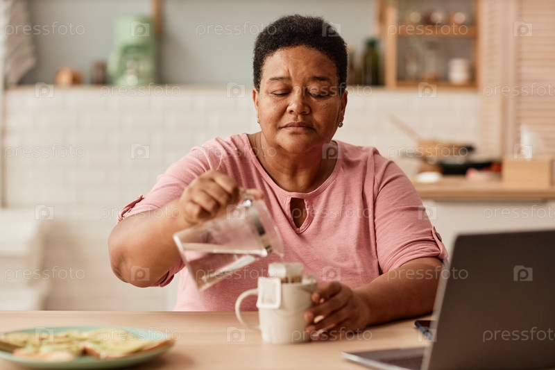 Пожилая женщина готовит чай во время завтрака