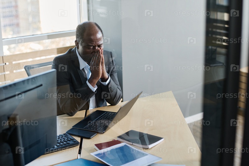 Стрессованный зрелый бизнесмен с руками, соединенными лицом