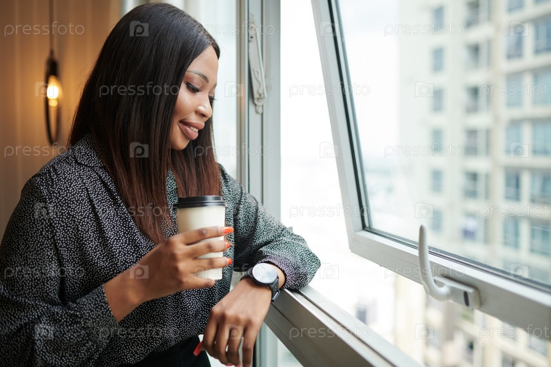 Деловая женщина наслаждается видом из окна квартиры