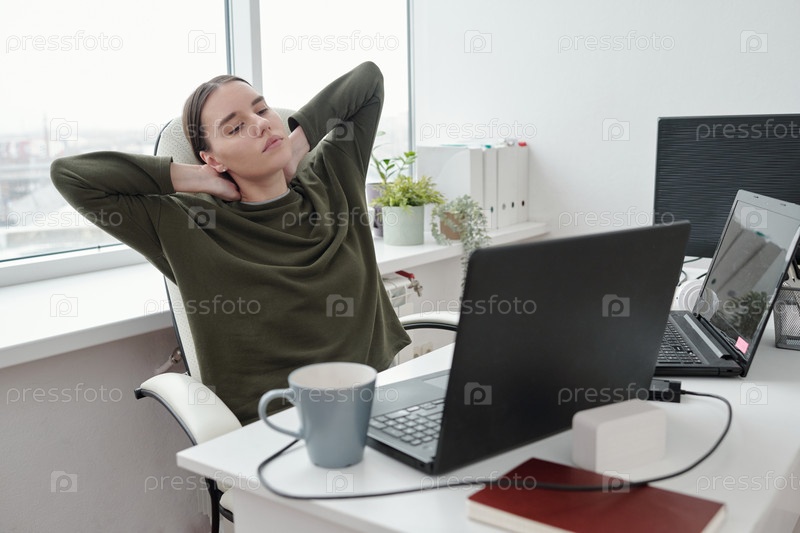 Молодая расслабленная женщина-программист делает упражнения для шеи и рук у стола