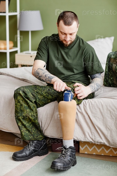 Портрет военного ветерана, исправляющего протез ноги