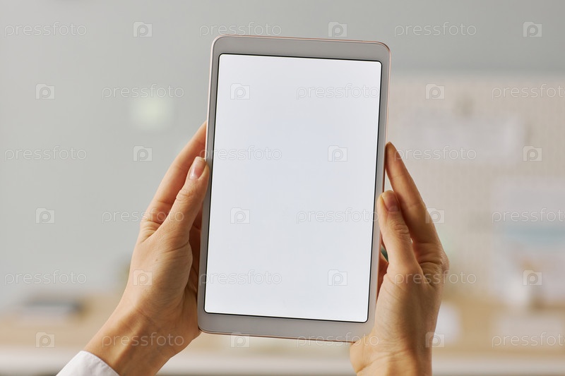 Руки, держащие цифровой планшет с белым экраном