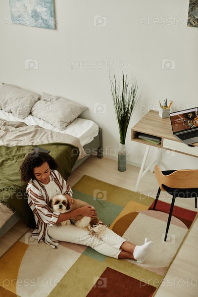 Молодая женщина сидит дома на полу и обнимается с маленькой собачкой
