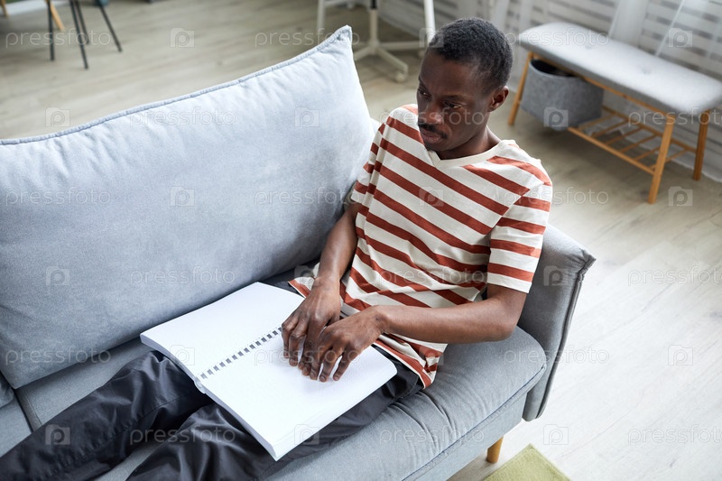 Человек с нарушениями зрения читает книгу и расслабляется дома