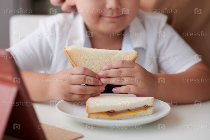Мальчик, съедающий бутерброд с ветчиной и сыром