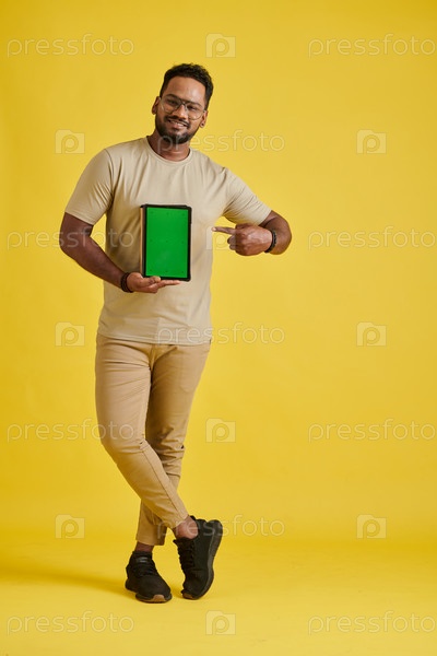 Программист держит планшетный компьютер Happy