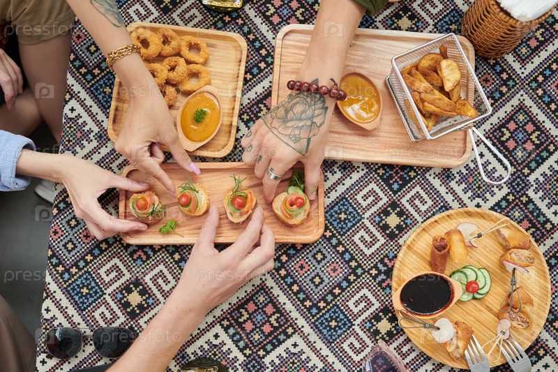 Молодые люди едят закуски
