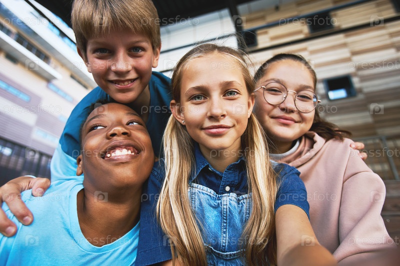 Четыре счастливых мальчика и девочку-подростка, делающие селфи на свежем воздухе