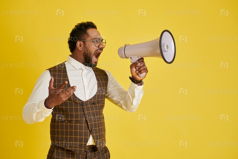 Эмоциональный мужчина кричит на мегафоне
