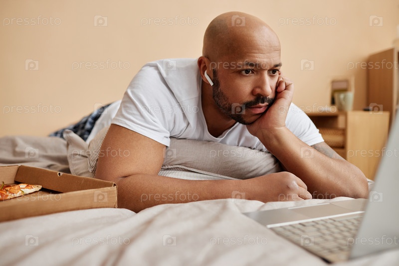 Взрослый чернокожий мужчина лежит дома в постели и смотрит фильмы во время ленивых выходных