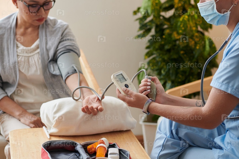 Медсестра использует электронный тонометр