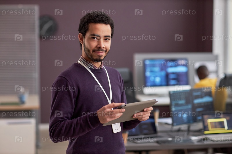 Улыбающийся инженер-программист держит цифровой планшет, стоя в техническом офисе