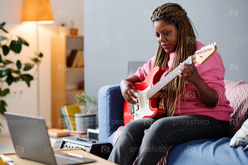 Женщина использует ноутбук, чтобы научиться играть на гитаре
