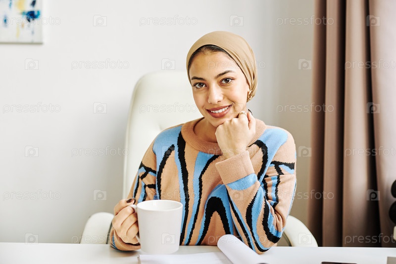 Элегантная мусульманка в роли босса улыбается на камеру в офисе