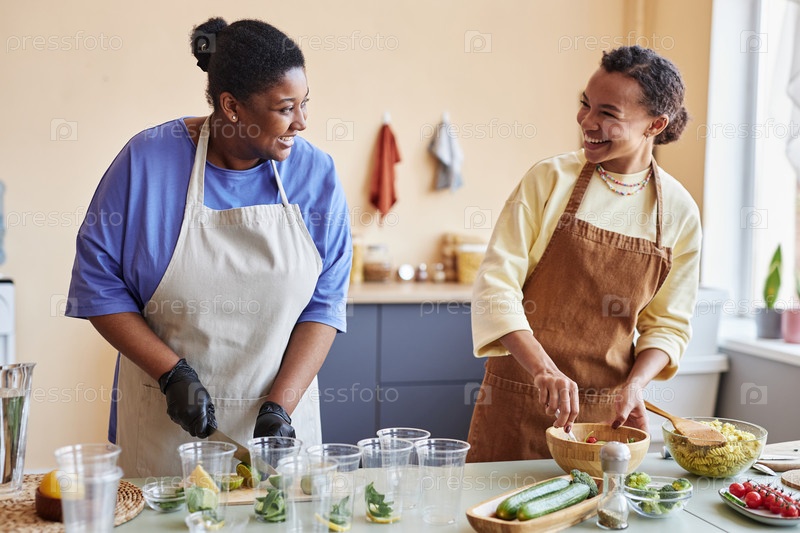 Две улыбающиеся молодые женщины развлекаются на кухне, готовя вместе