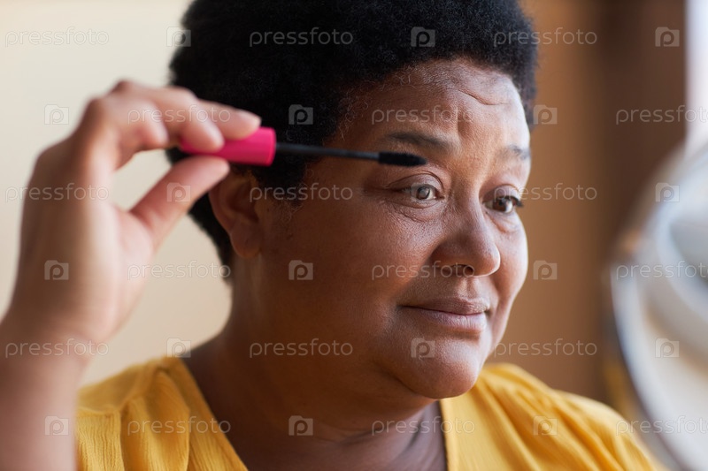 Сосредоточьтесь на лице зрелой женщины, прикладывающей черную маскару к ресницам