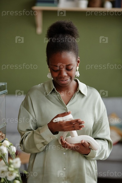 Счастливая молодая черная женщина в умной блузке, держащая белого змея