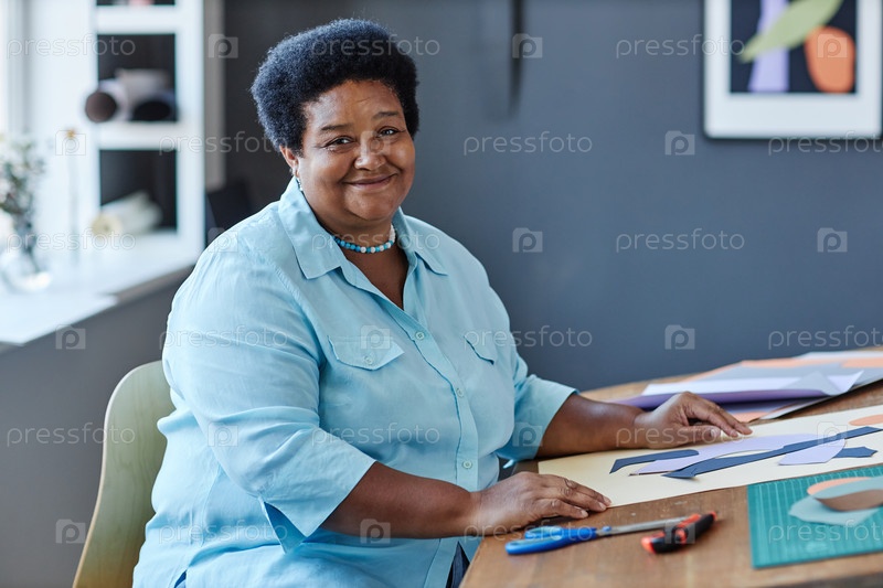 Счастливая пожилая женщина-дизайнер смотрит на камеру, работая над новым произведением искусства