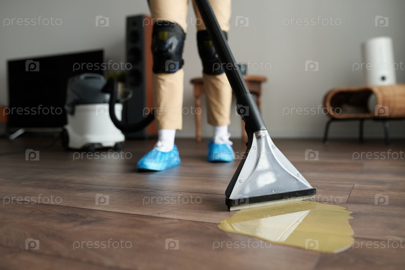 Профессиональный уборщик пылесосит грязный пол