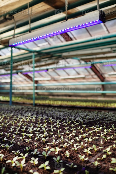 Вид на большую современную теплицу или вертикальную ферму с длинными рядами саженцев