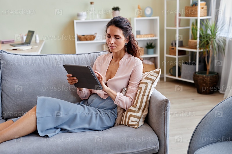 Элегантная женщина использует цифровой планшет дома, отдыхая на диване